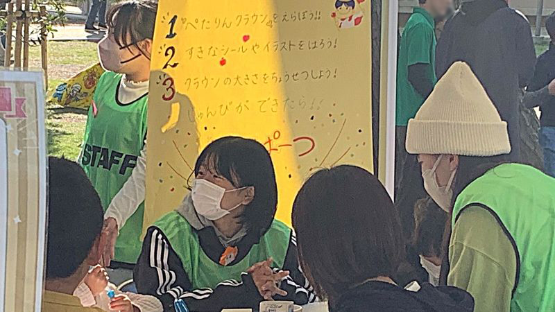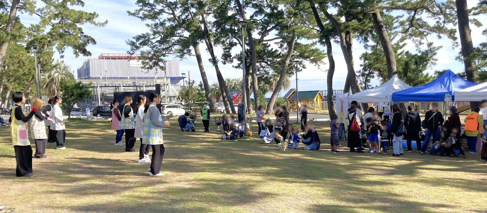 さらに『マグロ尾の身カツのっぽ』や本学陶芸部による陶器販売、手遊びの公演や昔話のお芝居もあり、一日中楽しめるイベントとなりました。子どもたちには、大浜公園の遊具を巡るシールラリー『こうえん探検隊』が大人気。公園内の遊具を巡りながらシールを集め、紙の王冠『ぺたりんクラウン』を完成させ、冒険気分を満喫する姿が見られました。