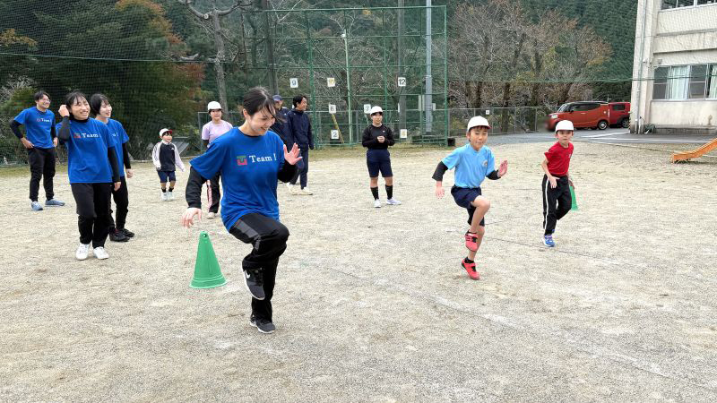 学生は大学で学んだ知識を活かしながら、児童たちに速く走ったり、高く跳んだりするための体の使い方や筋肉の動きをわかりやすく説明し、一緒に体を動かしました。また、腕振り・腿上げなどの基本動作に加えて、スキップや変形ダッシュなどさまざまな動きを取り入れ、運動が得意な児童もそうでない児童も楽しみながら学べるよう工夫しました。
