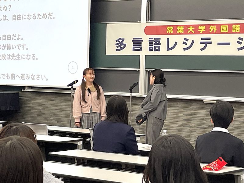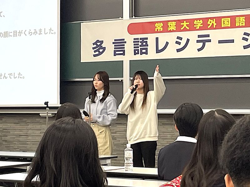 大会では、詩や戯曲といった課題文を暗唱・朗誦し、暗唱力・発音・表現力が審査されました。県内から参加した静岡県立静岡城北高等学校・静岡県立吉原高等学校・静岡県立田方農業高等学校・静岡県立掛川東高等学校の生徒たち、さらに岡山の創志学園高等学校の生徒も素晴らしい発表を披露し、大学生たちの学習意欲を一層高めました。