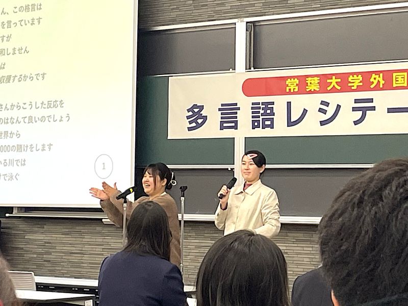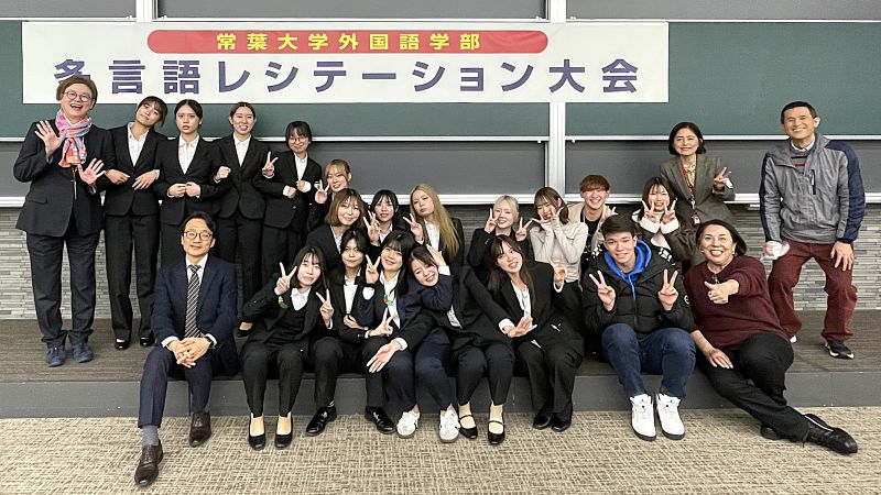 2025年12月13日(土曜日)、外国語学部グローバルコミュニケーション学科主催による『第12回多言語レシテーション大会』が静岡草薙キャンパスで開催されました。本大会は、外国語学部の創設30周年を記念して2014年に始まり、以来毎年開催されています。今年度もグローバルコミュニケーション学科の2年生と3年生が学生実行委員として企画・運営を担当しました(委員長:清水 美緒さん〈3年〉)。