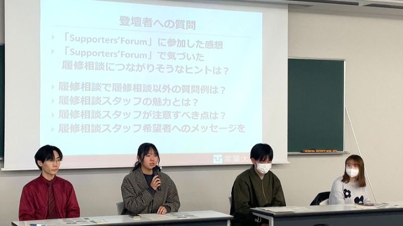 登壇した学修ピアサポーターから、『Supporters’Forum』で学んだこととして、学生スタッフ側も楽しむ必要性や新人スタッフへのサポートの大切さと、相談を通じて自分の大学生活を振り返ることになるなど学生スタッフの魅力等の紹介がありました。