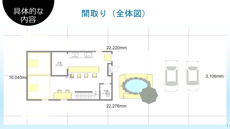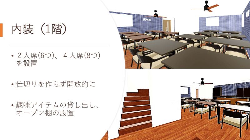 最終提案には、御殿場駅周辺の課題整理とそれに対する解決策としてのコンセプトを軸に、具体的な集客/営業方法に加え、5年間の収支計画、間取りや内装イメージなど、実際の事業を想定した内容も盛り込みました。
