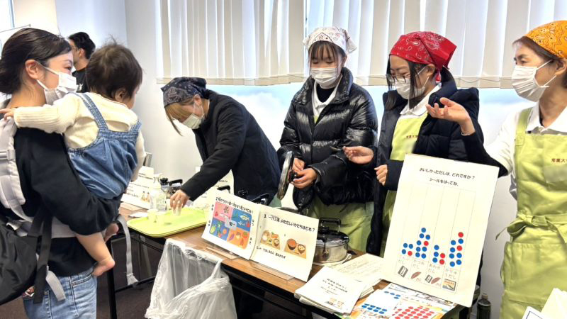 この活動に参加した古木美智子さん(健康栄養学科1年)は、「小さい子どもに興味を持ってもらうことが難しかった。年代にあわせた説明の仕方を工夫していきたい」と話しました。幅広い年代に和食の文化を知っていただく機会になりました。
