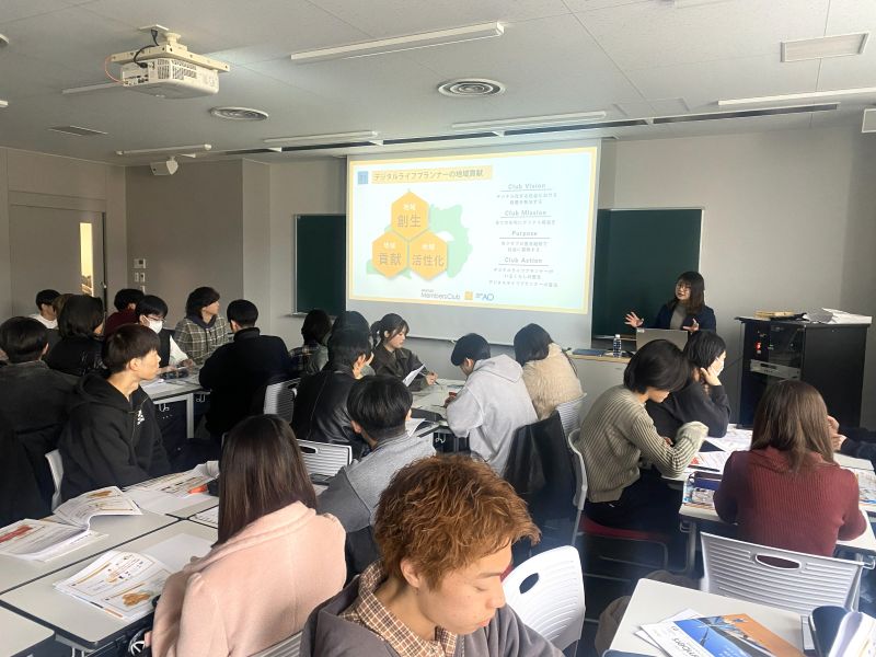 前半の講義では、デジタル技術が社会や地域にもたらす影響、DX が求められる背景、AI・IoT といった技術の基礎、そしてデジタルデバイドが生まれる理由について、同社のデジタルライフプランナーの加藤瑞帆講師より説明があり、学生たちは IT リテラシーの重要性を再認識しました。