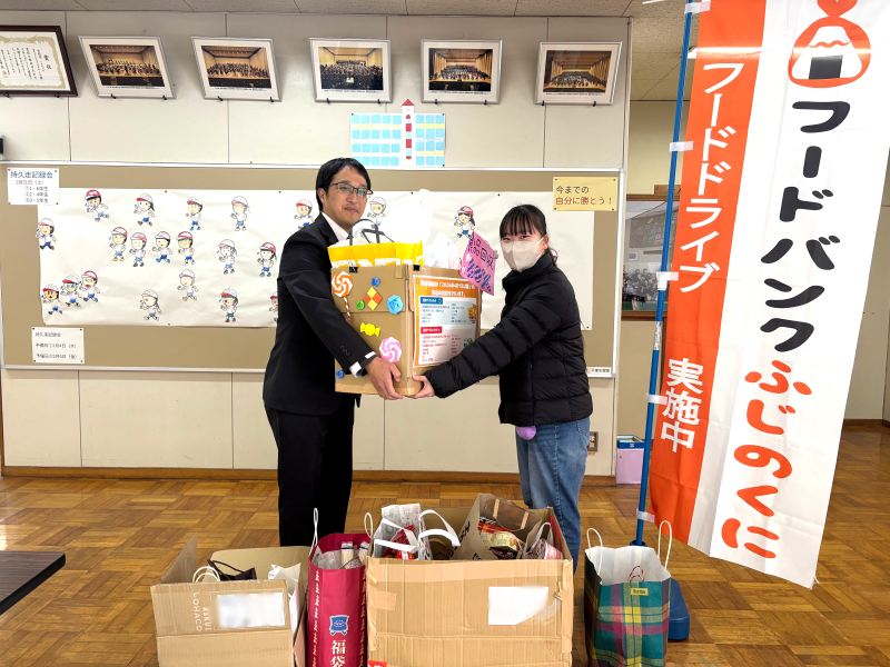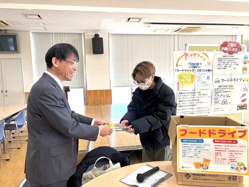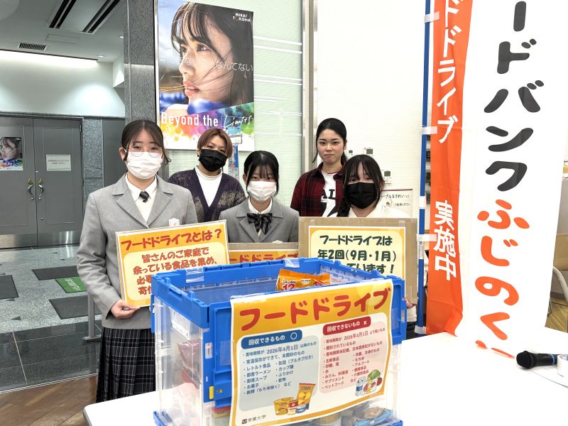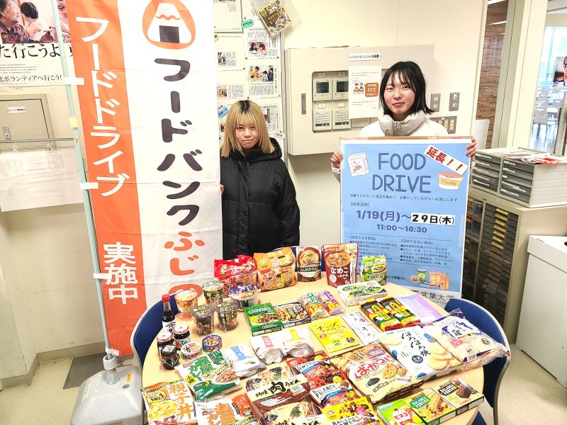 浜松キャンパスでは、1月19日(月曜日)から1月29日(木曜日)にかけて、有志の学生ボランティアが中心となり、学内へのポスター掲示や事前・当日の校内放送、回収BOX付近での呼びかけを行いました。学生ボランティアの呼びかけに足を止めて関心を示してくれる学生や教職員も多く、多数の食品を集めることができました。