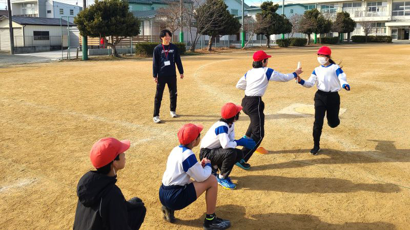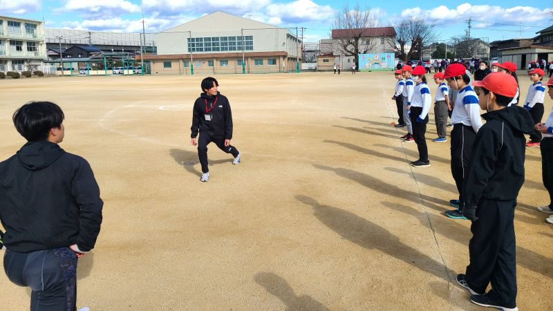 講師を務めた穐山拓海さん(スポーツ健康科学科4年)は、「普段、指導している中学生と違い、児童の反応や時間配分を見ながら臨機応変に進めていくのが難しかった。自分にとってもよい学びとなったし、児童から元気をもらった」と話しました。