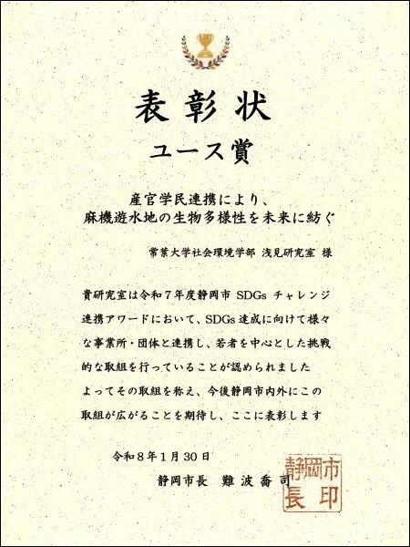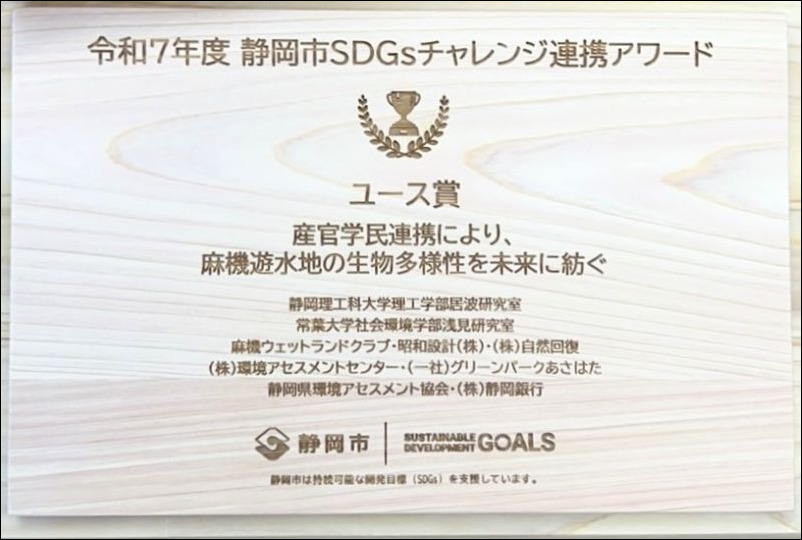 このたび、本活動が令和7年度静岡市SDGsチャレンジ連携アワードにおいて、『ユース賞』を受賞しました。産官学民による多様な連携体制を構築している点と、大学との連携により学生が調査・研究のみならず、実践的な活動まで主体的に担っている点が『非常に稀有で意義深い事例』として高く評価されました。