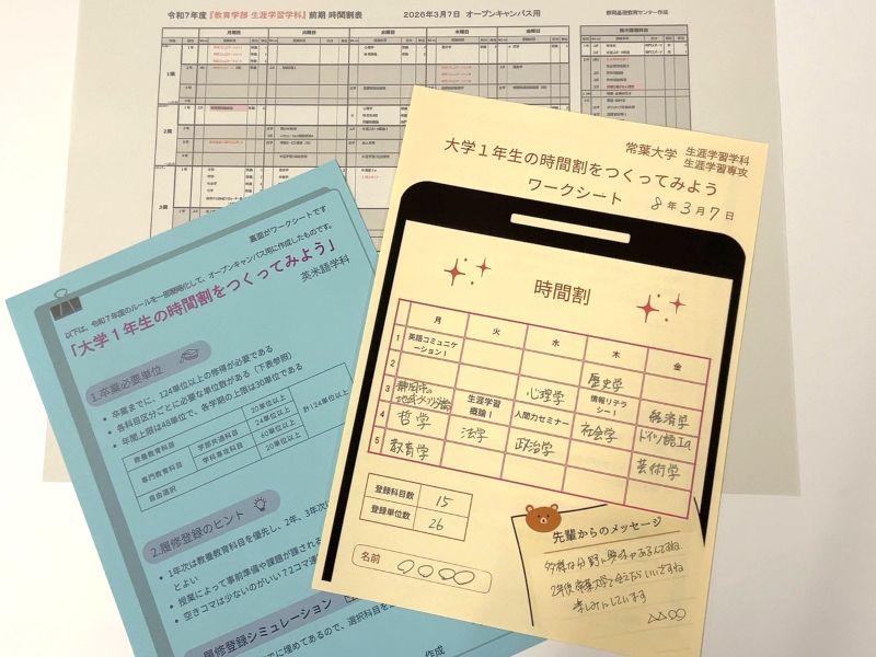 これは、学修ピアサポーターが新入生向けに実施している履修相談会のノウハウを応用したもので、高校生が自分で時間割を組むことで大学での学び方を理解できるだろうと企画したものです。