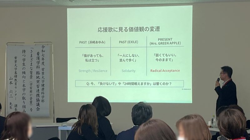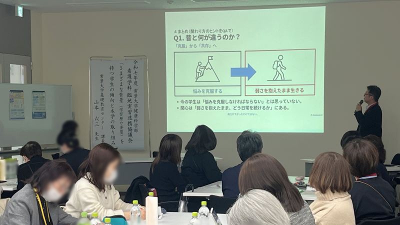 今回は、『さまざまな背景(学習歴や資質)を持つ学生の傾向と本学の取り組み』をテーマに、現代の若者世代の価値観や言動から学生の心情を理解することから始めました。本学静岡基礎教育センター課長の山本六三氏の講演の中で印象に残ったことは、若者世代に支持されているアーティストや現代の応援歌の歌詞と学生の言動から、現代の若者世代の価値観の変遷を知る視点でした。学生から発せられた言葉や行動のメッセージを、どのように観察し対応(関わる)ことがよいか、具体例から多くのヒントを得ることができました。その内容は、各学年で取り組む臨地実習での実習指導に大いに役立つ内容でした。