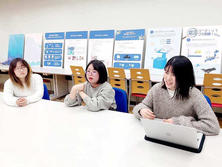 第3回目の取材は「誰でも簡単に商品を買うことができ、海洋プラスチックごみ問題の解決を手助けができるサービス “plusumi+”(プラスミー)」を制作した村松佑香さん、安藤南桜さん、荒城咲莉さんです。海洋ごみ問題に着目したきっかけや、チームで行った卒業制作について伺いました。