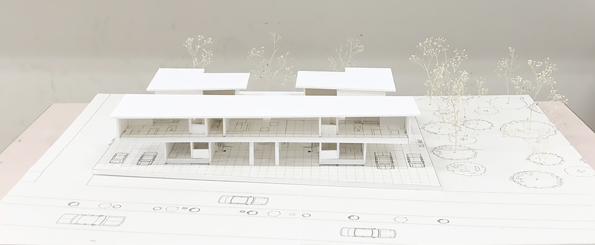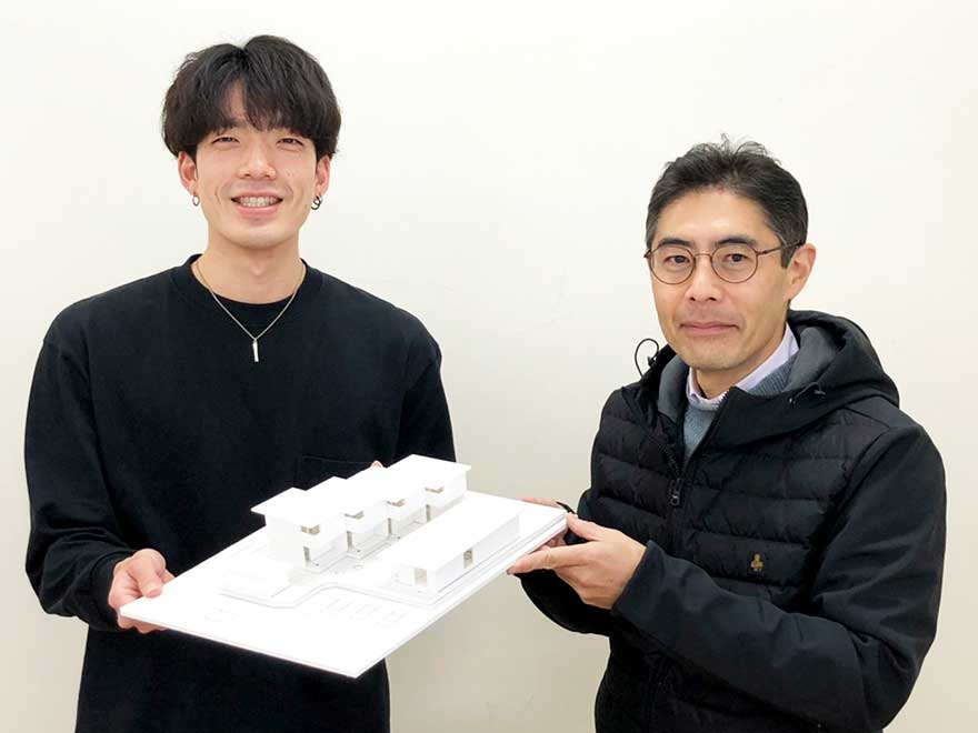 (写真の模型を示しながら)この課題を建築とからめて、学生の住むアパートみたいなもの、老夫婦と一般のひとが使えるシェアハウス、カフェを考えてみました。一つの土地で違う人たちが一緒に住むことでお互いに刺激を得ることができ、例えば学生が何をしているかを地域に発信し、そこでもっと交流が生まれたらいいなと思います」