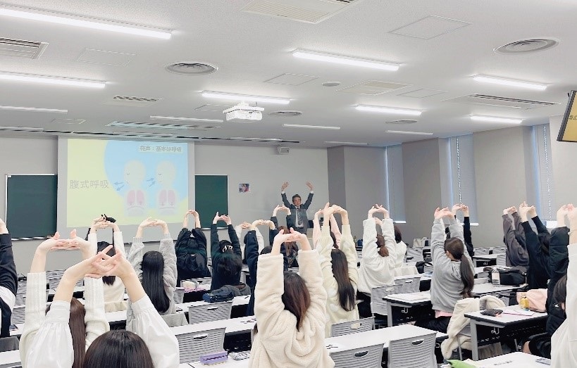 これは、放送の現場で活躍されているプロフェッショナルによる実務的な視点を通じ、日本語の音声表現や言葉について学ぶことを目的に開催されたものです。当日は、日本語日本文学科の専門科目「アナウンス入門」や「プレゼンテーション演習Ⅰ」を受講している1年生を中心に約45名が参加し、腹式呼吸や母音の大切さ、促音・長音・撥音などへの意識の重要性について、実践を交えながら学びました。