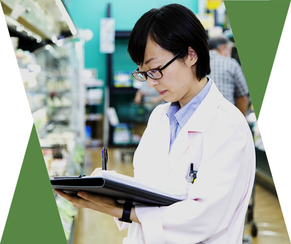 店舗での栄養相談会などで管理栄養士として、お客さまと接しています。栄養相談会では、参加される方の血圧・骨密度・血管年齢や筋肉量・脂肪量などを計測し、その結果を元にさまざまなアドバイスをしています。その他、個別に行う30分程度の栄養指導も担当しています。