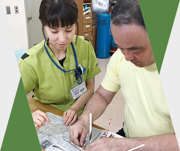 作業療法士として、脳卒中などの病気やケガ、また寝たきりになったことで起こる廃用症候群などによって日常生活が困難になってしまった方が、その人らしく生き生きと安全に社会生活が送れるよう、医療支援を行っています。