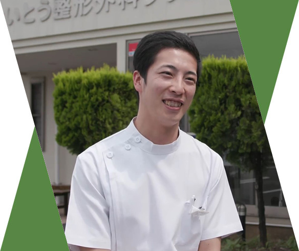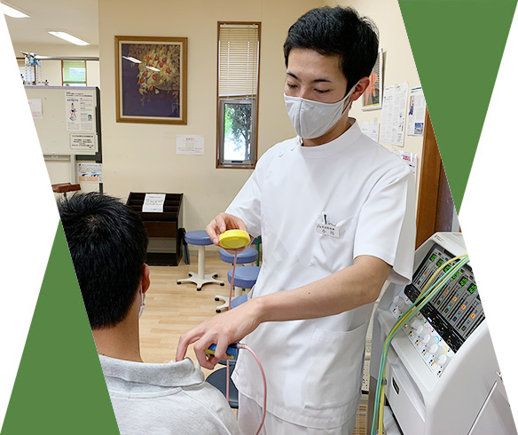 私が勤務する整形外科クリニックでは、電気などを用いた物理療法を取り入れた治療を行っています。私は柔道整復師として、骨折や脱臼、ねんざなど突然のケガ(外傷)で来られる患者さんに、患部の固定などの応急処置をしています。特に骨折や脱臼を負った患者さんには、整形外科医である院長の指導のもと、患部を正常範囲に復位させる徒手整復を行います。また、必要に応じて松葉杖の使い方指導も行っています。