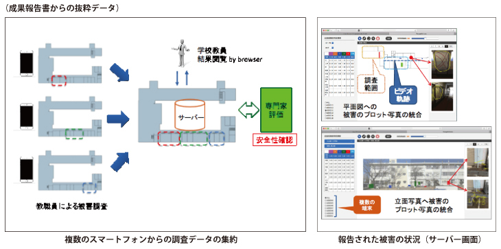 このシステムでは、開発したスマートフォン・アプリを用いて学校施設の被災状況を教職員が調査し、調査結果を建築専門家に送信し、安全性の判断を求めることが可能となる。