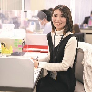 市民保健課国保年金係で、後期高齢者医療に携わり、保険証の作成や高額医療費制度への申請などを担当しています。大学時代、ゼミで防災の出前講座やワークショップに参加し、自分の伝えたいことをしっかり伝える力、相手の話を聞く力が鍛えられました。このスキルが、窓口で役立っています。今後は、大学で学んだ防災の知識を活かせるように、活動の幅を広げていきます。