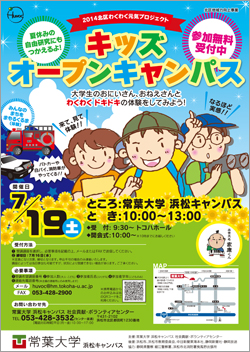 浜松キャンパスの社会貢献・ボランティアセンターが主催するイベント「キッズオープンキャンパス」が7月19日(土曜日)に、浜松キャンパスにて開催されます。