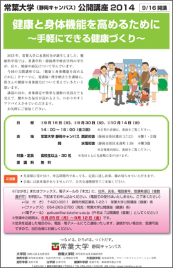 平成26年度 常葉大学静岡キャンパス(水落校舎)の公開講座が9月16日(火曜日)からスタートします。