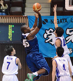 東海1位で9年連続12回目の出場となった男子バスケットボール部は、初戦で新潟経営大学と対戦し99-60で快勝しました。インサイドとアウトサイドのバランスがよく試合の序盤から効果的に加点し、危なげない試合展開となりました。