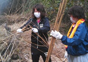 海岸付近の竹林から竹を取り、140cmほどの長さに切る作業を地元NPO団体「カメハメハ王国」の方とともに実施しました。汗ばむような陽気のなか、学生は熱心に活動をしました。