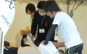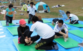 本学心身マネジメント学科アスレティックトレーナーサークル(CATS)の学生20名と、宮村司教授と吉田早織講師が4月14日(日曜日)、掛川市体育協会の要請により、約400名のランナーに対してストレッチやアイシング、傷害相談などのサポートを行いました。