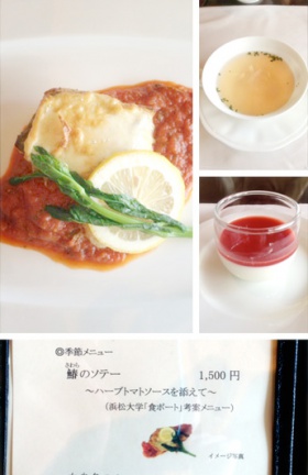 提案者は食ポートの鈴木菜穂さん(健康栄養学科4年)などで、春のメニューを提案してほしいと依頼を受け何品か提案したところ、鰆のソテー、ハーブトマトソース新玉ねぎと春キャベツのスープパンナコッタ、いちごソースの3品が連理でアレンジされて採用されました。