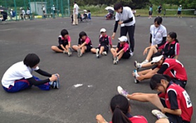 大会の参加者は中学生で、男女合わせて約400名の参加があり、傷害発生時の応急処置、熱中症予防の呼びかけ、ストレッチ指導、スポーツ傷害相談等を行いました。