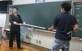 5月20日(月曜日)は浜松市立都田南小学校で、教職員に対して不審者が侵入した際の対応訓練が実施されました。学生は警察官が行う講義の補助役として、逮捕道具を手に協力しました。