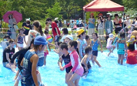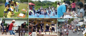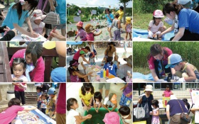 今回は、『真夏のこどもむら「なつだ!あついぞ!水遊びだ!」』をテーマに、手作りプール水遊び、ひまわり迷路、染め紙作り、大工さん体験、御菓子すくい、生き物観察とタッチング、手作りうちわ作り、水鉄砲遊びを行いました。