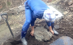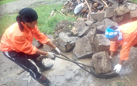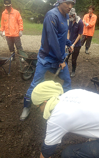 小雨も降る中行われた活動は、校舎の中に入り込んだ土砂をスコップで何度もかき出す作業、校庭に積み上げられた瓦礫や大きな岩を数人がかりで運び出す作業、ごみや廃品を積み込む作業。
