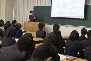 「接遇マナー講座」では、面接官に対する言葉や動作のマナーを長谷川真知子教授のご指導のもと、学生たちは一言一句漏れがないよう真剣に聞き、他の学生と差のつくマナーを学びました。