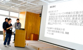 本学からは法学部の柴ゼミの学生が「地域活性化―商学連携による大学とまちのつながりの創出」に関する研究を発表しました。法学部1年生の石川仁也さん、松山諒平さん、海野晃さんが「なぜ学生がまちに求められているのか?」という観点で、静岡の商店街の課題や、学生の取り組みについて報告をしました。