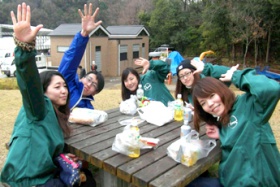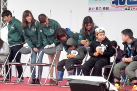 当日は、あいにくの雨模様でしたが、学生たちは、ステージでのイベント補助や、特産品のブース担当、会場の案内係、そしてゆるキャラの着ぐるみに入って来場者とふれあうなど、積極的に役割を担っていました。