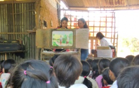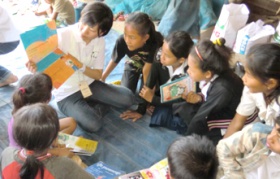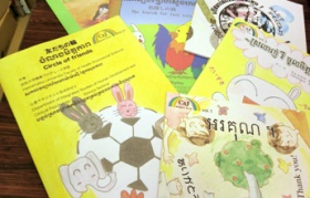 絵本は、クメール語(カンボジア語)・英語・日本語の三カ国語に翻訳されており、カンボジアスタディツアー(2月25日~3月1日)において、学生自身が絵本を持参し、カンボジア国内の村(ルセイスロック村、チュティア村、プレークスワイ村、スレイアンピル村)において移動図書館を実施し、絵本の読み聞かせや作成した絵本教材を使って、日本語教室・英語教室を行い、異文化交流を行ってきました。
