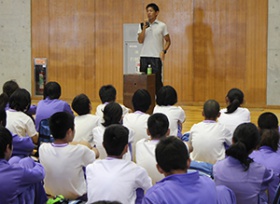 石田さんは、4月に行われた世界学生トライアスロン選手権日本代表に選出され、団体3位、個人14位というすばらしい成績を収めました。日本代表にまで登りつめた石田さんが、生徒たちにこれまで経験した苦労や努力を語りました。レースの失敗から学んだ練習方法や、これまでに出会った指導者や関係者の人たちへの感謝を忘れないことなどを話してくれました。生徒たちは、自分と年齢が近く、お姉さんのような存在の石田さんの話を夢中になって聞いていました。