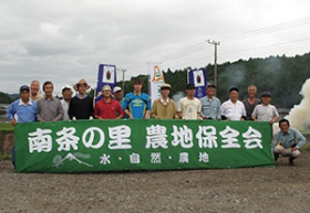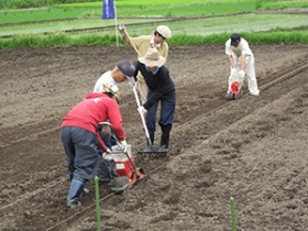 本学社会環境学部の学生が6月28日(土曜日)、富士宮市下条の農地で、遊休農地の有効活用などに取り組んでいる南条の里 農地保全会の方たちと大豆の種まきを行いました。