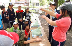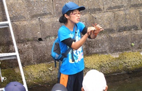 新人隊員として市内の小学4~6年生34人が参加。総隊長には社会環境学部の山田辰美教授を迎え、新人隊員のリーダーとして自然体験活動研究会の学生18人も参加しました。新人隊員の児童は、指導綱引きや水鉄砲、川流れなどの川遊びや田宿側に生息するカルガモ、アユ、手長エビなどの生き物探しなどを繰り広げ、水辺に親しみました。
