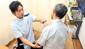 相談コーナーでは、健康プロデュース学部健康鍼灸学科と健康柔道整復学科の教員と学生による肩こりや腰痛相談が行われ、なかでも鍼灸師を目指す学生は、教員の指導のもと来場者の相談に応じ、刺さない鍼を使った健康へのアドバイスを行いました。