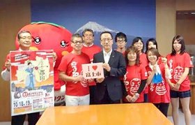 開催前の10日(金曜日)に富士市役所を訪問し、小長井義正富士市長に出展の報告をした澤本慎太郎さん(経営学部2年)は「富士つけナポリタン大志館スタッフとして、富士市の町おこしに貢献できるよう頑張りたい」と抱負を語り、同じくスタッフの藤岡麻美さんと津川志乃さん(ともに経営学部2年)は「大好きな富士の魅力を伝え、アピールして大勢の皆様に愛される富士にしていきたい」と富士市のまちおこしに向けた決意を語りました。