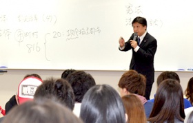 法学部 林昌宏講師の講義「政策評価論」の一環として、公務員らに仕事の内容を話してもらうプログラムで実施したもので、田辺市長は学生に政令指定都市の名称を言わせたり、政令の意味を解説したりして講義を盛り上げました。受講した学生からは「いろんな自治体の比較などが大変興味深かった」などの感想が聞かれました。