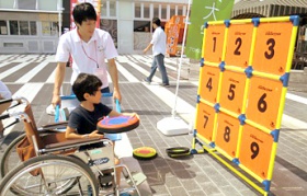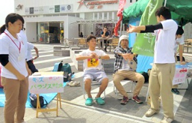 また、健康プロデュース学部心身マネジメント学科の学生が所属するアスレティックトレーナーサークル「CATS」は、長距離運転の腰痛対策のブースを出展し、ストレッチの方法などのサポートを行いました。また、子供向けイベントとしてバランスボール対決やどろだんご作りのブースを出し、サービスエリアに立ち寄られた親子連れに楽しんでいただきました。
