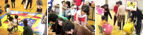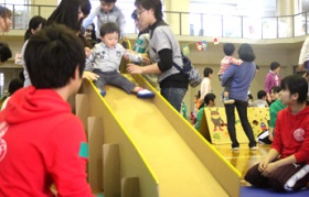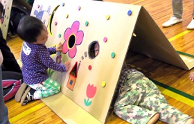 子どもたちは学生たちの背中を歩いたり、270㎝の大型パズルを組み立てたり、発砲スチロールの動物大玉ころがしなどで遊び、最後に段ボール製のトンネル、強化段ボールで作製した滑り台、ピットウレタンにジャンプするなど、からだ一杯使って遊びました。子どもたちは学生に見守られながら、思いっきり飛び跳ね、元気いっぱいの笑顔を見せてくれました。