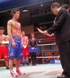 新人王決勝戦までの3戦を1試合のTKO勝ち、残りの2試合も3-0の判定勝ちと、圧倒的な強さで勝ち上がり決勝を迎えました。決勝は対戦相手が前日計量をパスし、不戦勝での全日本新人王獲得となりました。