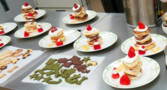 クリスマス会では、健康プロデュース学部健康栄養学科の学生が所属するサークル「食ポート」がお菓子作りの指導を行い、少年と保護司、学生が一緒にケーキなどのお菓子づくり体験を行いました。
