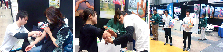 「東京マラソンEXPO 2015」が2月19日(木曜日)~21日(土曜日)に東京ビッグサイトで開催され、静岡県富士市にある医療機器メーカー「東洋レヂン株式会社」からの出展協力依頼により、本学健康プロデュース学部の沢崎健太准教授、村上高康准教授(健康鍼灸学科)、星川秀利准教授(心身マネジメント学科)と健康鍼灸学科の3名の学生がSOMANIKS(刺さない鍼)を使用した研究紹介とランナーケアスタッフとして参加しました。