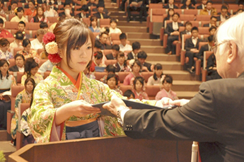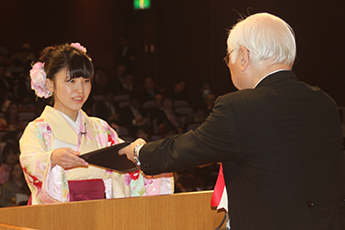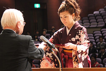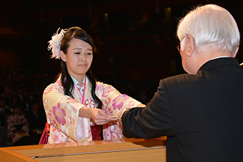 卒業生を代表して、2児の母親として子育てや家事と学業を両立し、全学生の中でもっとも優秀な成績を収めた健康栄養学科の福島弘子さんが「大きな壁にぶつかっても自分の可能性を信じてまっすぐ進んでいきたい」と決意を述べました。