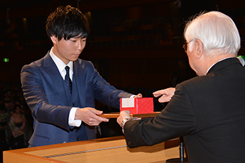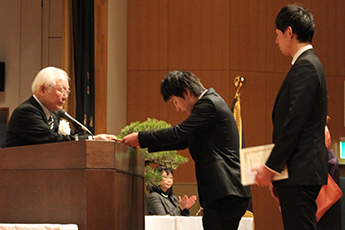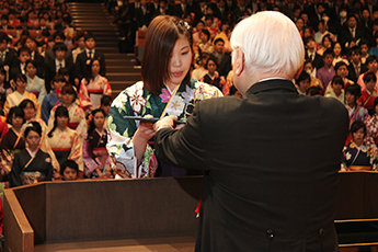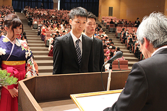 西頭德三学長は、学生代表に学位記を手渡し「長期的かつ広い視野から物事を判断して、良き人生と良き家庭を築いてほしい」と告辞を述べました。
