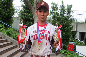 5月23日(土曜日)に清水庵原球場で行われた2015年度東海地区大学野球春季選手権大会において、打率0.800という好成績を残した浜松キャンパス硬式野球部の小池俊輝選手(経営学部3年)が優秀選手、首位打者、ベストナイン(外野手)の3部門を受賞しました。