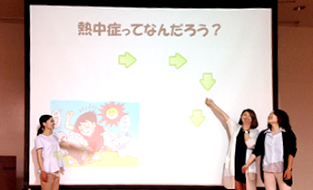 講師として参加したのは、健康栄養学科3年生選択科目の「健康スポーツ栄養学」履修者の酒井千裕さん、秋山美涼さん、浦島彩乃さんの3名で、当日は1時間弱の講習会に加え、3名が会場を回って個別の質問にも応対しました。